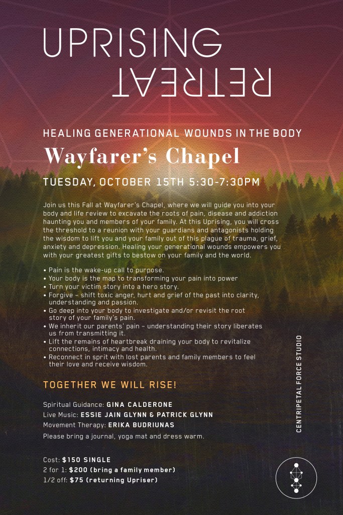 The Uprising Retreat was magnificent under the redwoods in the tranquil stone and glass sanctuary, designed by Frank Lloyd Wright. We joined together atop the cliffs and symphonic shores of the Pacific Ocean in Palos Verdes, California. Gina Calderone, DPT, my childhood friend and co-author in researching the book Invisible Wounds, has uncovered and healed generational wounds in the body for hundreds of individuals and families. She guided us through the body scan and life review to excavate the roots of chronic pain, cancer, depression and addiction. We inherit our parents’ pain – understanding their story liberates us from transmitting it to our children. These Uprisings give us a chance to rise up, transform our pain into power to be the hero of our families, homes and communities.
