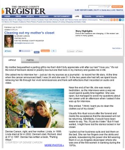 Denise Carson writes the Parting Ways Column in the Orange County Register where she explores how individuals, families and communities are reinventing their role in life’s final frontier to celebrate memories, traditions and legacies with new personalized rituals that turn the alienation at the end of life into a celebration.